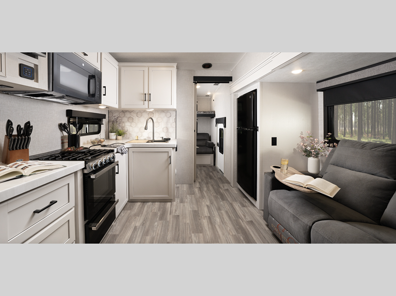 Sleeps 8 Slides 1 Length 34 ft 8 in Ext Width 8 ft Ext Height 13 ft Int Height 8 ft 5 in Interior Color Calli Linen Hitch Weight 1770 lbs GVWR 10750 lbs Dry Weight 8995 lbs Cargo Capacity 1755 lbs Fresh Water Capacity 52 gals Grey Water Capacity 82 gals Black Water Capacity 45 gals Tire Size ST225/75R15E Furnace BTU 35000 btu Number Of Bunks 2 Available Beds Olympic Queen Refrigerator Type GE 12V Refrigerator Size 10 cu ft Shower Size 30" x 36" Number of Awnings 1 LP Tank Capacity 30 lbs Water Heater Type On Demand AC BTU 15000 btu TV Info LR 4K Ultra LED HD Smart TV Awning Info 19' Electric w/Integrated LED Lights Axle Count 2 Washer/Dryer Available Yes Number of LP Tanks 2 Shower Type Standard Electrical Service 50 amp Similar Floorplans