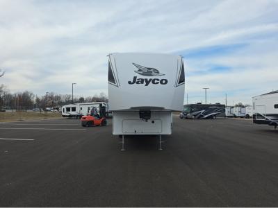 With any Eagle SLE fifth wheel by Jayco, you will enjoy a lighter tow weight, high-end finishes, and the same quality construction you've come to expect from Jayco! There is an Alpha Ply TPO roof membrane, a fully enclosed and heated underbelly, plus Stronghold VBL walls for added durability. There is also a rear 2" towing receiver outside, along with metal slam latch baggage doors, MORryde Step Above entry steps, and a Winegard Air 360 antenna with router prep if you want to stay connected as you camp. Once inside you'll enjoy the handcrafted door/drawer fronts, shower skylight, and residential vinyl flooring throughout with no carpet for an easier clean. The on-demand water heater, 30K BTU furnace, and 15K BTU "Whisper Quiet" A/C will ensure your comfort, and the Overland 1 Solar Package will provide off-grid capabilities!