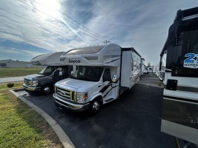 With any Greyhawk Class C gas motorhome by Jayco you will experience smooth sailing thanks to the JRIDE PLUS that comes with Koni shock absorbers, a computer-balanced driveshaft, Hellwig helper springs, and more. The Ford E-450 chassis with a 7.3L V8 325 HP engine will power your excursions, and you'll appreciate the added safety features for your peace of mind. Each model features a Sony infotainment center with Apple CarPlay and Android Auto, backup and side-view cameras, and a tire pressure monitor system the driver is sure to appreciate. Durable construction begins with Stronghold VBL roof, floor and sidewalls, bead-foam insulation, and a one-piece seamless fiberglass front cap. Head inside to find blackout night roller shades, LED-lit pressed countertops, an 84" interior ceiling height, and hardwood cabinet doors and drawers.