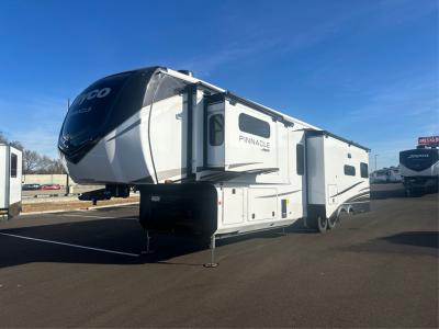 Each Pinnacle fifth wheel features Stronghold VBL lamination for the lightest, yet strongest construction in the RV industry. Add that to the Magnum Truss XL6 roof system and Climate Shield zero-degree tested weather protection and you'll be enjoying your fifth wheel even in harsh weather. Some of the exterior conveniences you will appreciate are the Keyed-Alike lock system, the fully enclosed, universal docking center, and the 6-point hydraulic auto-leveling system for quick and easy set up. The 5 Star Handling Package will make towing a fifth wheel a walk in the park, and the two Whisper Quiet A/C units will keep you comfortable during the hot summer months. Inside, you'll enjoy the residential "Do it all" sink, the solid hardwood cabinet doors, stiles, and fascia, the vinyl flooring throughout, plus many more comforts. There is even a central vacuum system, a wireless remote-control system, 12V charging station, plus many more conveniences to make each trip enjoyable.