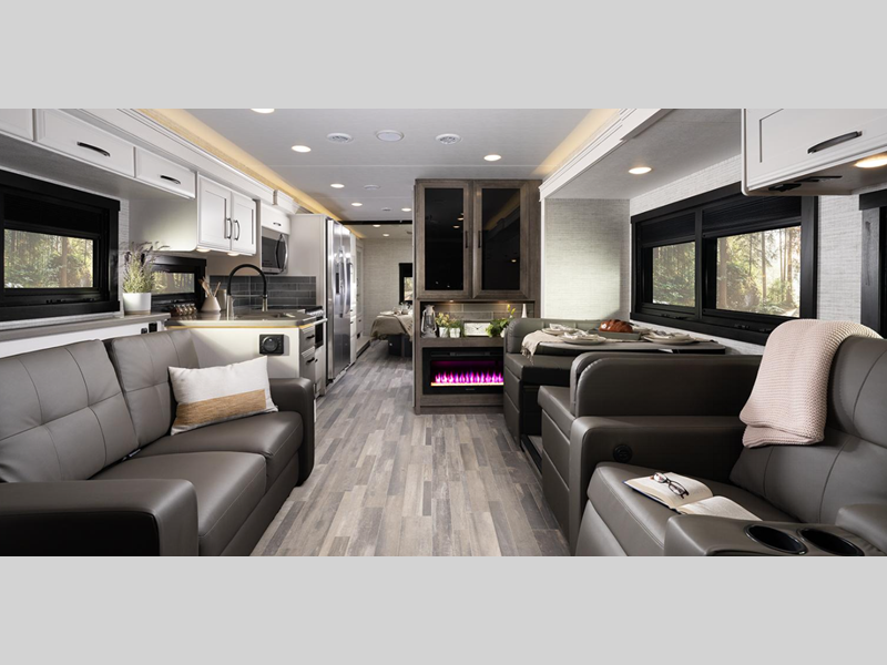 Sleeps 5 Slides 2 Length 36 ft 11 in Ext Width 8 ft 5 in Ext Height 12 ft 10 in Int Height 7 ft Interior Color Benton, Modern Farmhouse Exterior Color Standard Graphics. Full-Body Paint; Java, Soul Blue Hitch Weight 5000 lbs GVWR 22000 lbs Fresh Water Capacity 72 gals Grey Water Capacity 40 gals Black Water Capacity 40 gals Tire Size 235/80R22.5G Furnace BTU 30000 btu Generator 5,500-Watt Fuel Type Gasoline Engine 7.3L V8 Chassis Ford F53 Horsepower 335 hp Fuel Capacity 80 gals Wheelbase 228 in Available Beds King Torque 468 ft-lb Refrigerator Type Residential Cooktop Burners 3 Shower Size 30" x 36" Number of Awnings 1 LP Tank Capacity 16.5 gals Water Heater Capacity 10 gal Water Heater Type Gas/Electric AC BTU 28500 btu Basement Storage 117 cu. ft. TV Info LR 39" LED HD Smart TV, BR LED HD Smart TV, Exterior LED HD Smart TV Awning Info 18' Electric with LED Lights Washer/Dryer Available Yes Gross Combined Weight 26000 lbs Shower Type Standard Electrical Service 50 amp Similar Floorplans