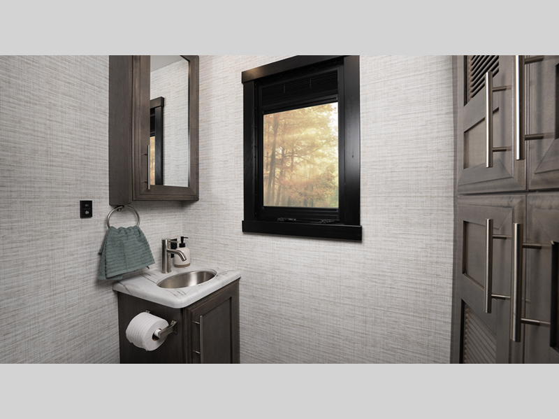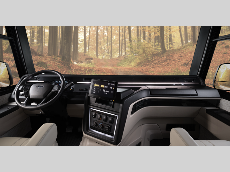 Sleeps 5 Slides 3 Length 33 ft Ext Width 8 ft 5 in Ext Height 12 ft 10 in Int Height 7 ft Interior Color Benton, Modern Farmhouse Exterior Color Standard Graphics. Full-Body Paint; Java, Soul Blue Hitch Weight 5000 lbs GVWR 22000 lbs Fresh Water Capacity 72 gals Grey Water Capacity 40 gals Black Water Capacity 50 gals Tire Size 235/80R22.5G Furnace BTU 30000 btu Generator 5,500-Watt Fuel Type Gasoline Engine 7.3L V8 Chassis Ford F53 Horsepower 335 hp Fuel Capacity 80 gals Wheelbase 228 in Available Beds RV King Torque 468 ft-lb Refrigerator Type Residential Cooktop Burners 3 Shower Size 30" x 36" Number of Awnings 1 LP Tank Capacity 16.5 gals Water Heater Capacity 10 gal Water Heater Type Gas/Electric AC BTU 28500 btu Basement Storage 108 cu. ft. TV Info LR 50" LED HD Smart TV on Lift, BR LED HD Smart TV, Ext. LED HD Smart TV Awning Info 16' Electric with LED Lights Gross Combined Weight 26000 lbs Shower Type Standard Electrical Service 50 amp Similar Floorplans