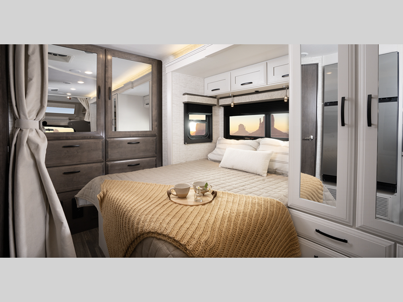 Each is built with a Stronghold VBL™ roof, floor, and sidewalls creating the lightest, yet strongest construction, and a one-piece, seamless fiberglass front cap that resists damage from moisture and debris. There are also aluminum running boards for easy entry into the cab and the main entrance which includes the industry's largest travel-view window and electric-powered step with an integrated house battery compartment. The interior offers seatbelts in all designed seating locations to protect your loved ones, hardwood cabinet doors and drawers for style and durability, high-intensity recessed LED ceiling lights and LED-lit slideout fascia, plus an interior command center and pleated blackout shades for privacy.