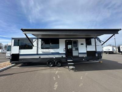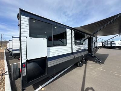 Each model features an 8' wide construction, an AlphaPly TPO roof membrane, and a flat front metal with tough coat for added protection. You will also appreciate the pass-through storage compartment outside, along with a power tongue jack and power awning with LED lights. Inside, there is LED lighting throughout, blackout night shades, seamless pressed membrane countertops and many more comforts.