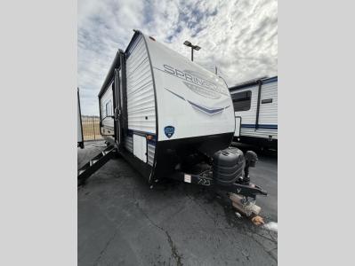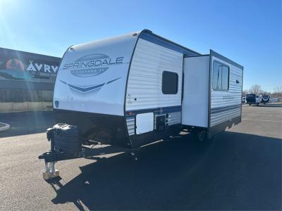 With any Springdale travel trailer by Keystone you will enjoy convenient amenities and comfortable camping features at every turn. The aluminum exterior will be easy to clean, and the power awning provides protection against the hot summer sun. There is also an exterior shower, a walkable roof, and an XL entry assist handle to safely enter and exit the unit. You will find many comforts inside, including a stainless steel sink, ample storage space for your belongings, and cozy sleeping spaces. Start a new adventure today in a Springdale travel trailer!